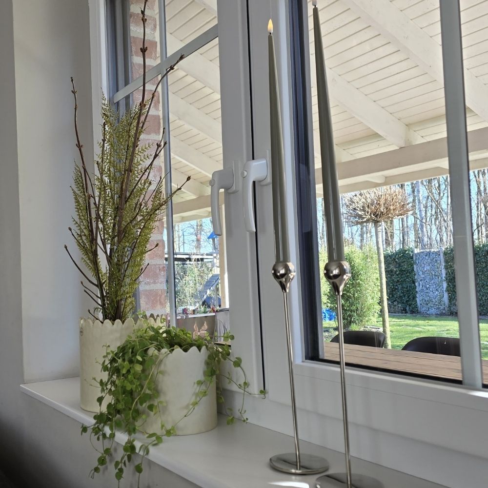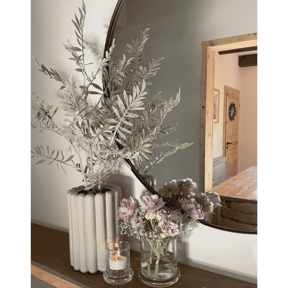 Dabei musst du nicht alles in einer Vase mischen. Oft wirkt es sogar noch natürlicher, wenn die Kombination im Arrangement entsteht: Zum Beispiel ein künstlicher Grünzweig im Übertopf, daneben eine Vase mit frischen Blumen und ergänzt durch ein Windlicht. Genau dieses Zusammenspiel macht die Deko lebendig und besonders stimmig.