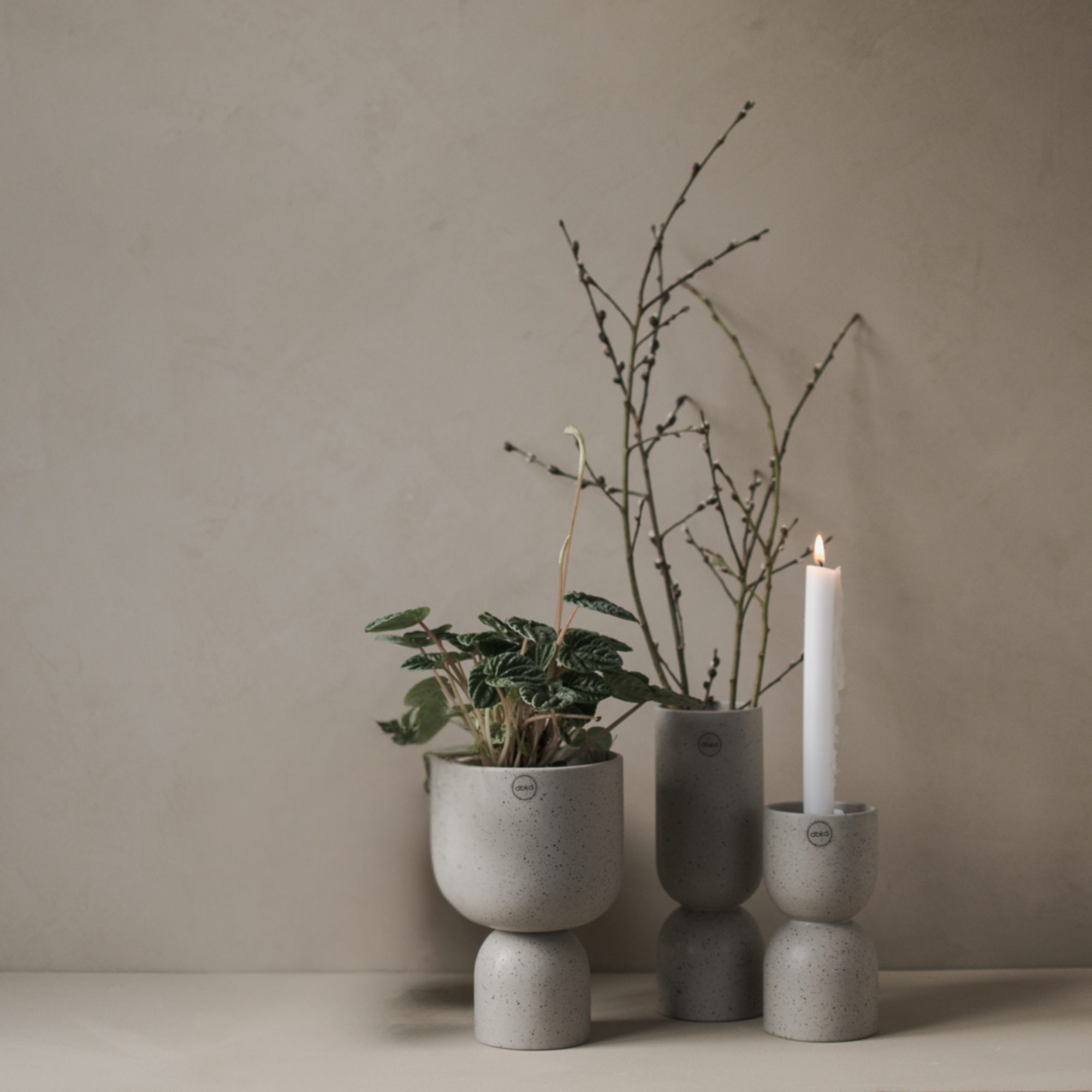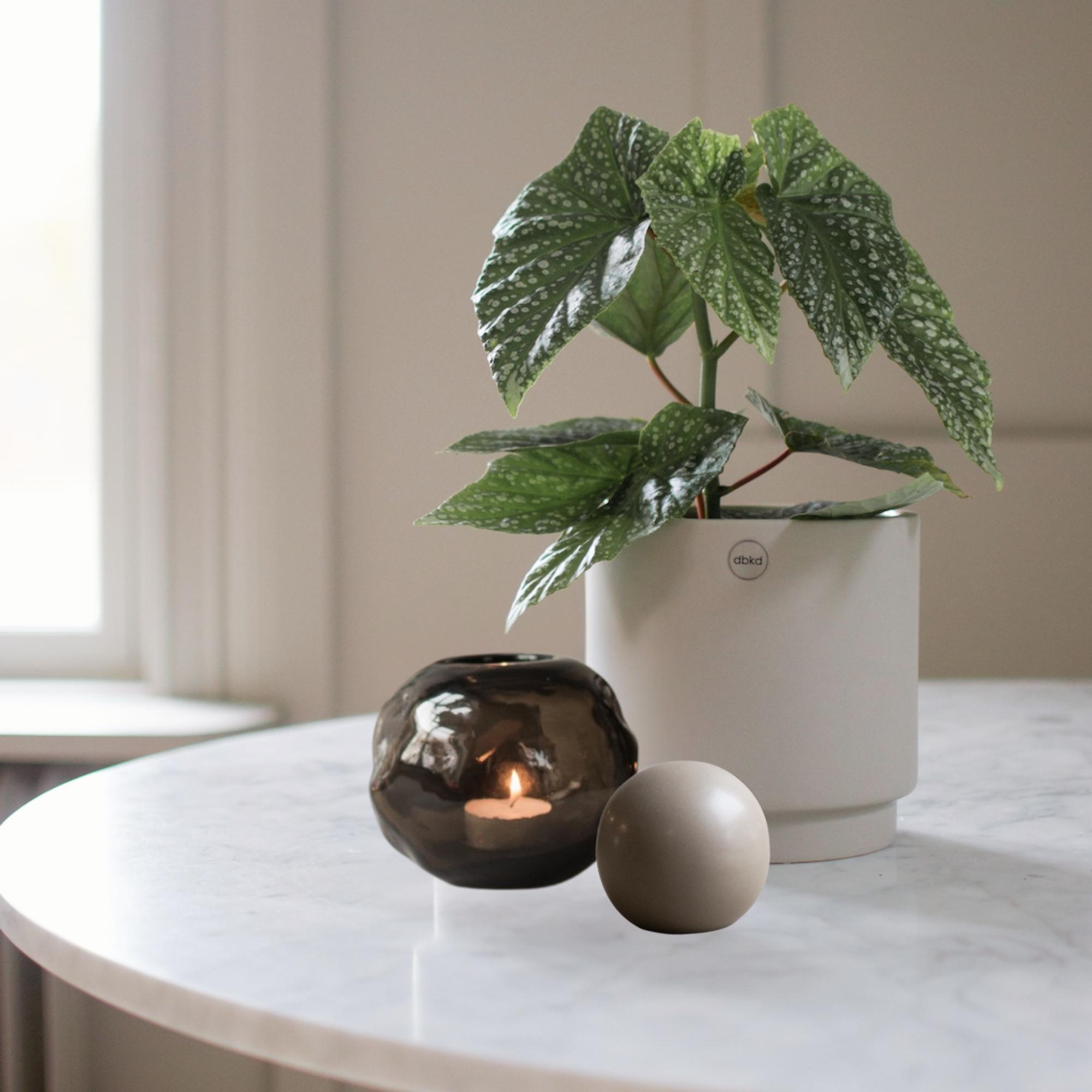 Auch auf dem Tisch funktioniert ein Übertopf perfekt als Dekoelement. Kombiniere ihn zum Beispiel mit einem Windlicht und einer Skulptur. Dieses Arrangement kannst du das ganze Jahr über stehen lassen oder immer wieder saisonal anpassen, zum Beispiel mit anderen Pflanzen oder Zweigen.
